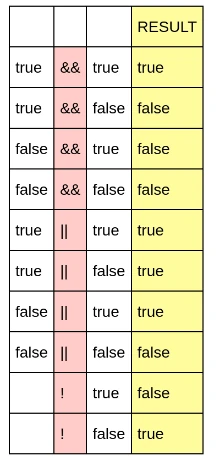 &&means “and”, and it will returntrueonly if both values aretrue, otherwise it will returnfalse||means “or”, and it will returntrueif at least one of the values istrue, otherwise (if they're both false) it will returnfalse!means “not”, it's applied before a boolean, and it will flip it: if the boolean it'strueit will returnfalse, and vice versa.